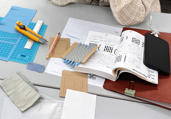 1年次では素材の種類や生地の組成などの基本知識を学びます。2年次は様々な加工方法を学びそれぞれのテクニックを駆使したマテリアル制作を行います。スラッシュキルトやニードルパンチなどの加工で効果的にみせるデザインを考案しスワッチを制作します。
