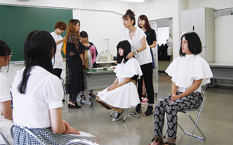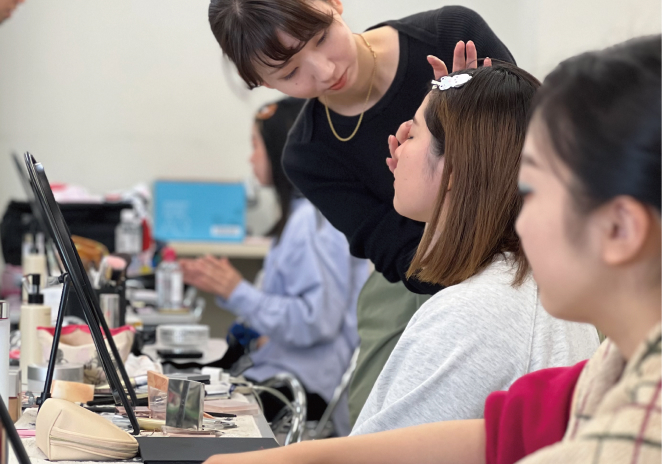 ヘアスタイリングとメイクアップの知識や技術について学びます。美しい仕上がりに欠かすことのできない、皮膚や毛髪の知識、ヘアメイクの手順といった基礎技術から、シーンや目的に合わせた応用技術の習得を目標とします。