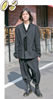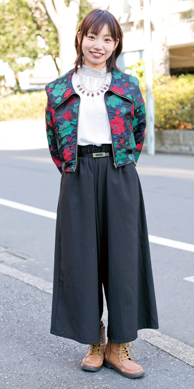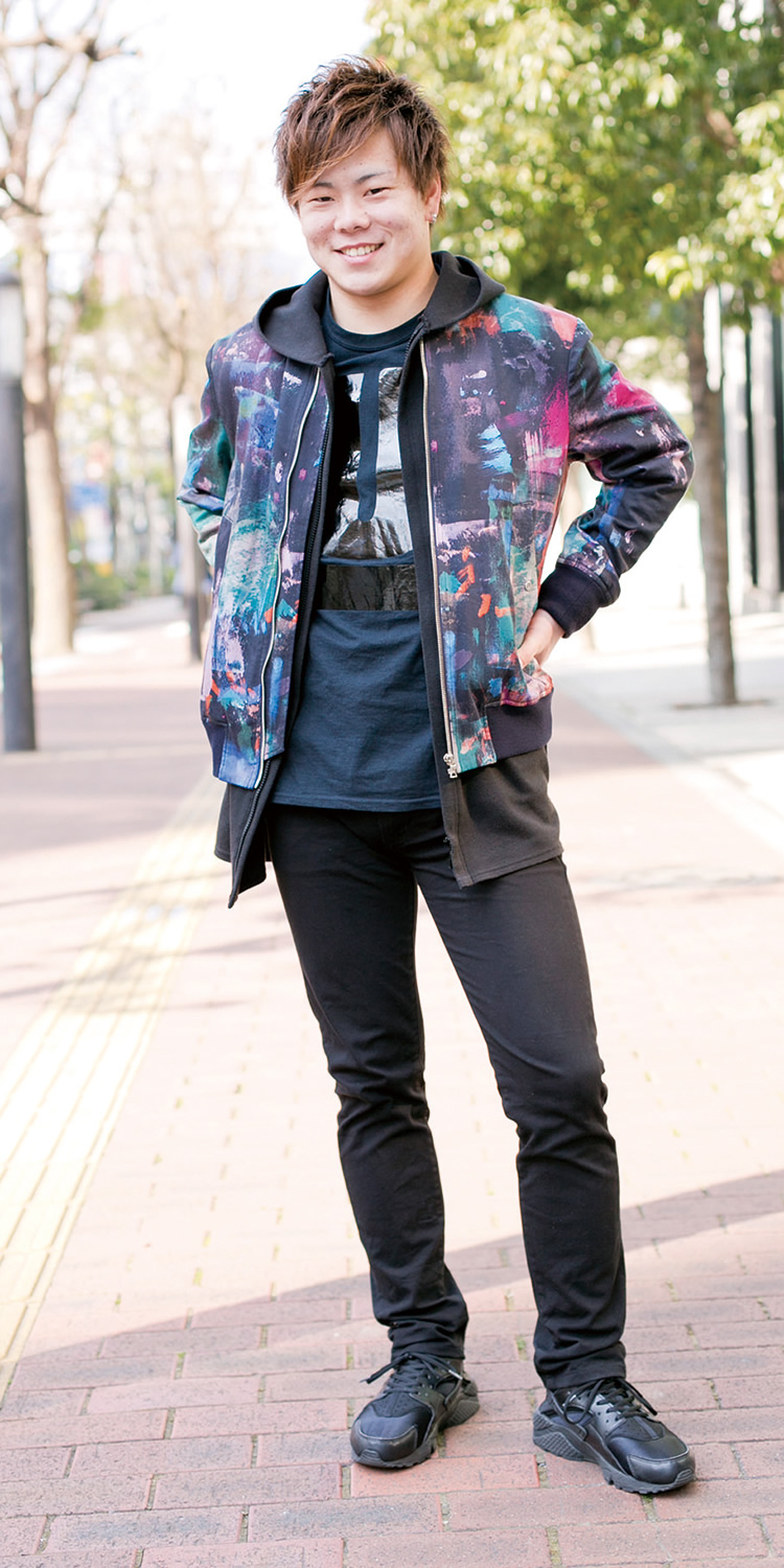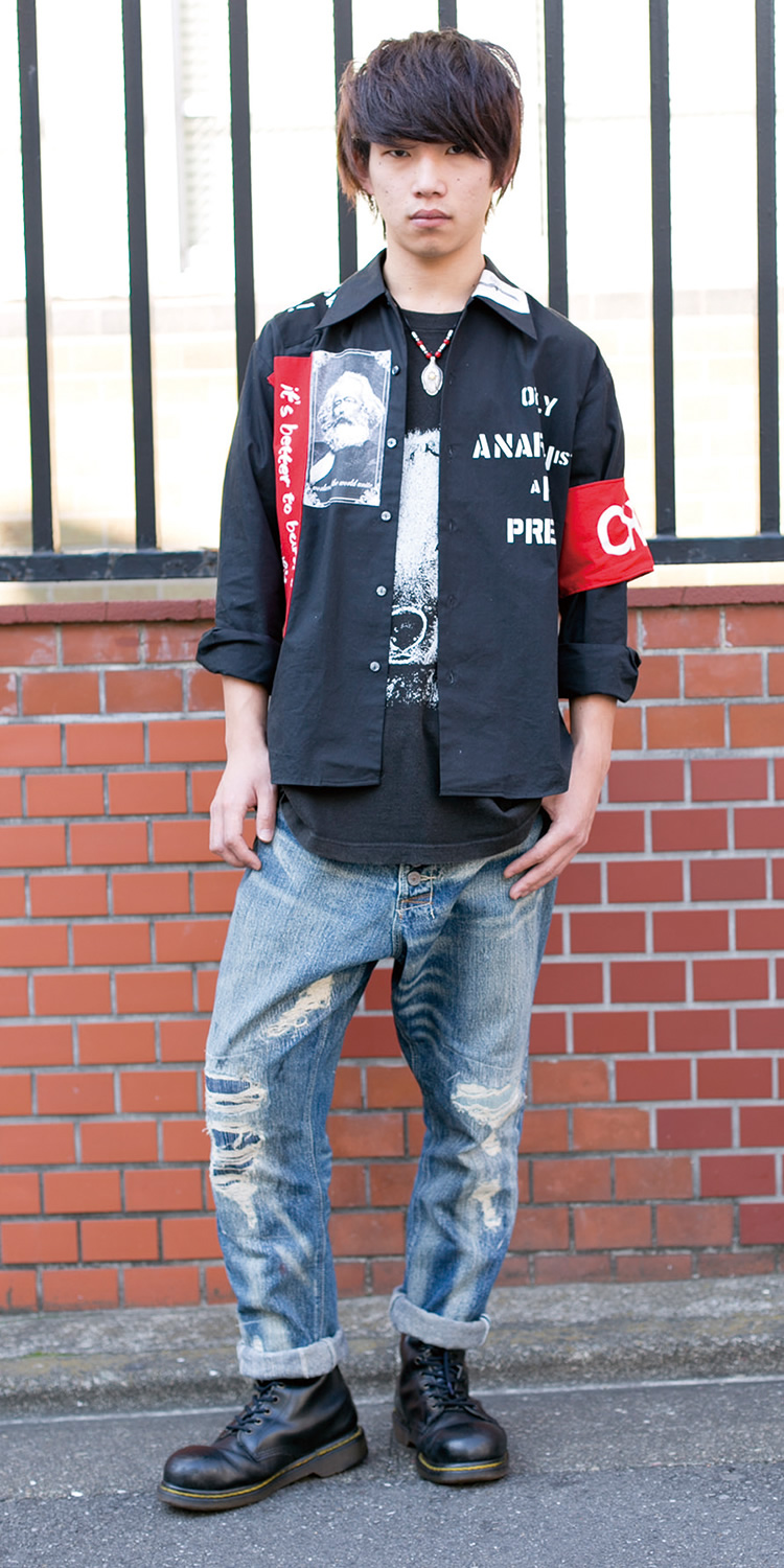 シャツのワッペンがポイントですね。個性的なアイテムが好きで、みんなと違う服装を心がけています。