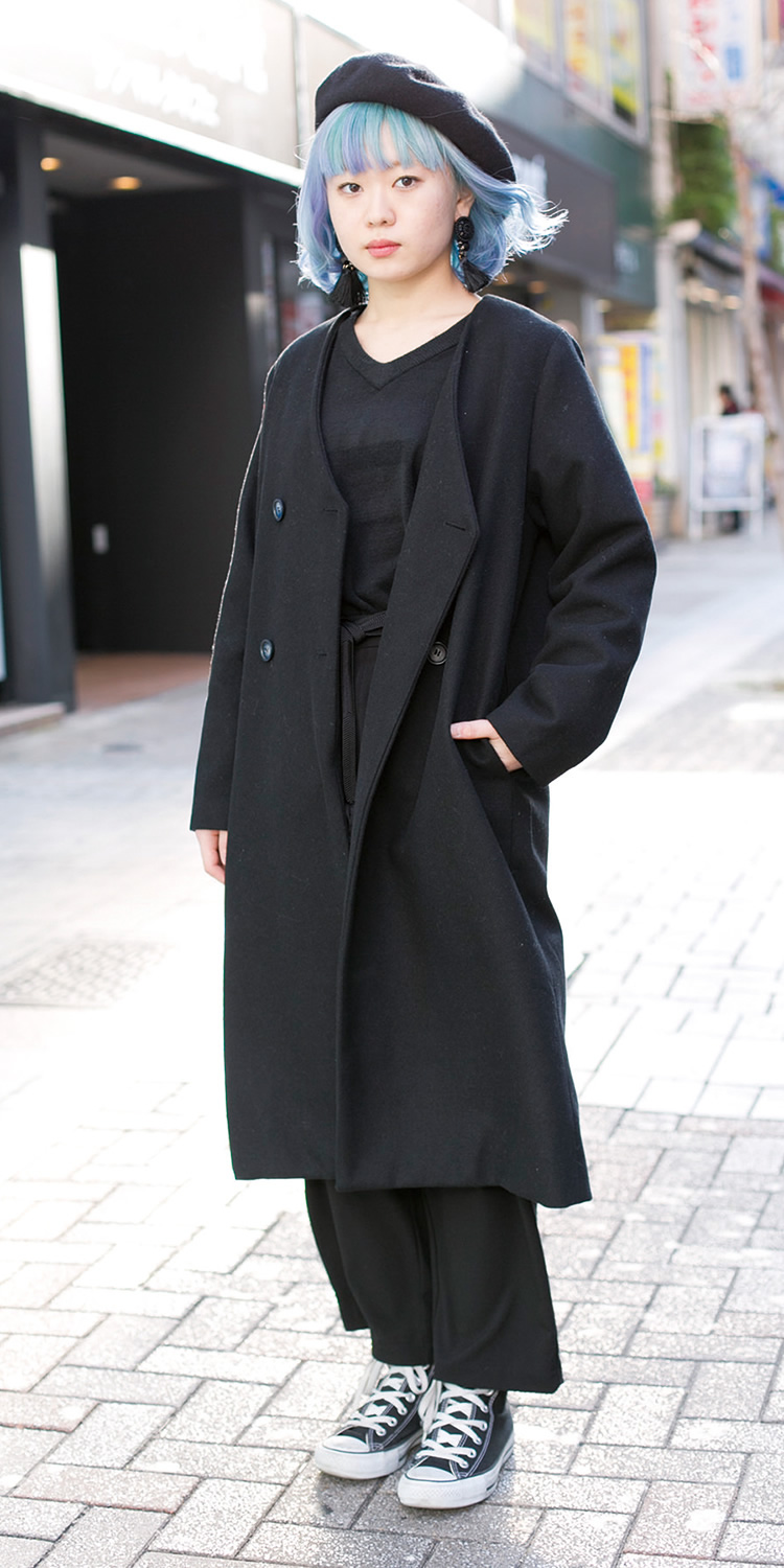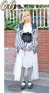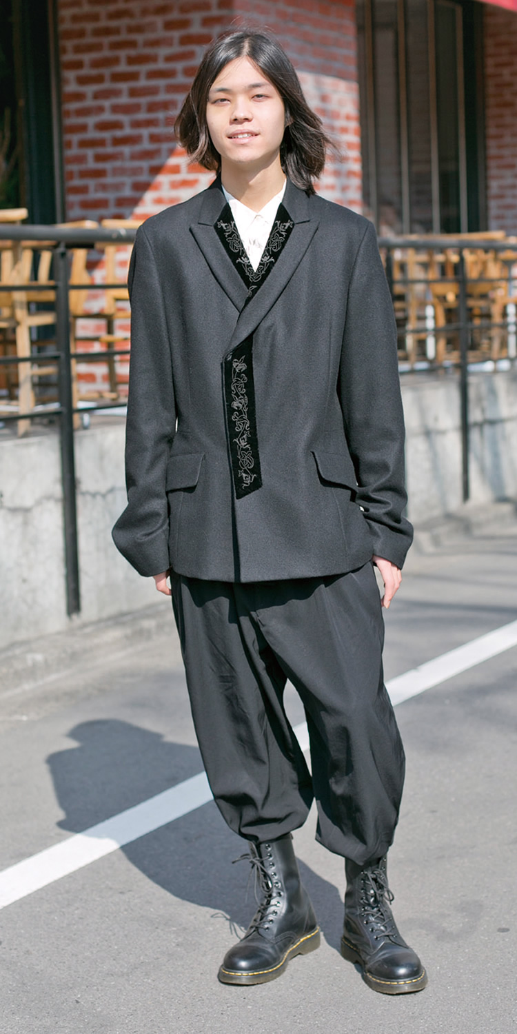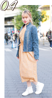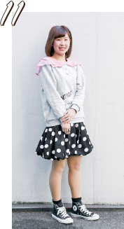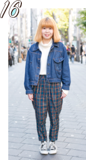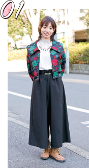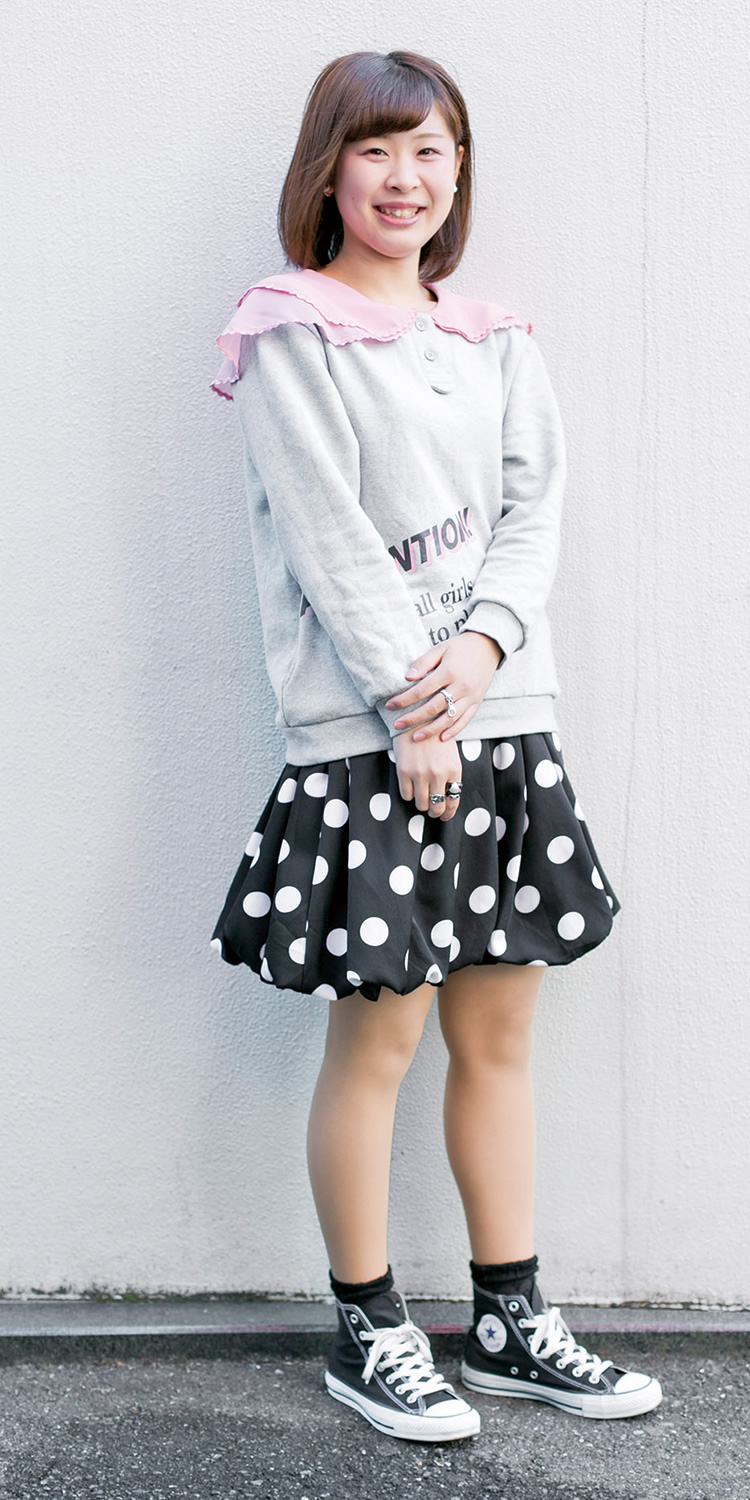 シャツのワッペンがポイントですね。個性的なアイテムが好きで、みんなと違う服装を心がけています。