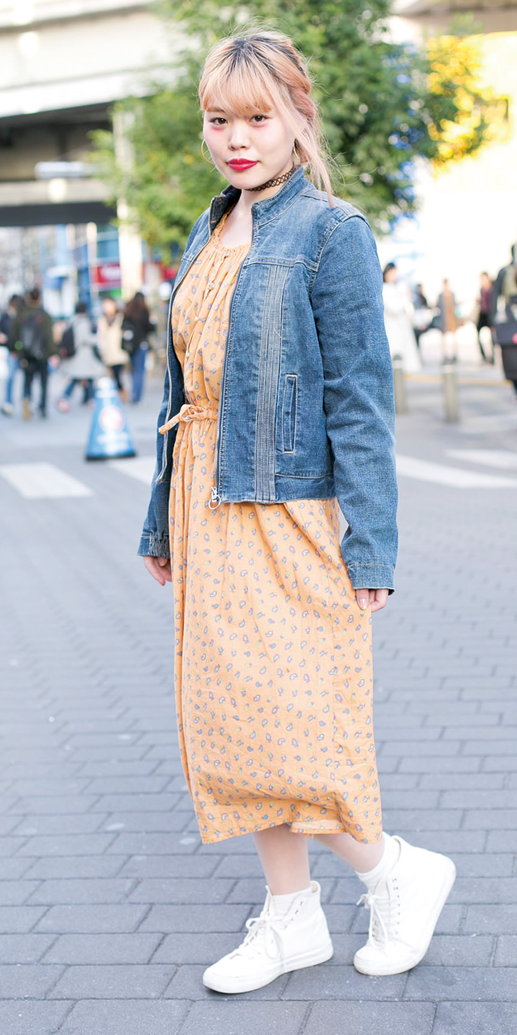 ポイントはオレンジと白の春っぽさとチョーカーです。パンツが苦手でスカートやワンピースが多いですね。
