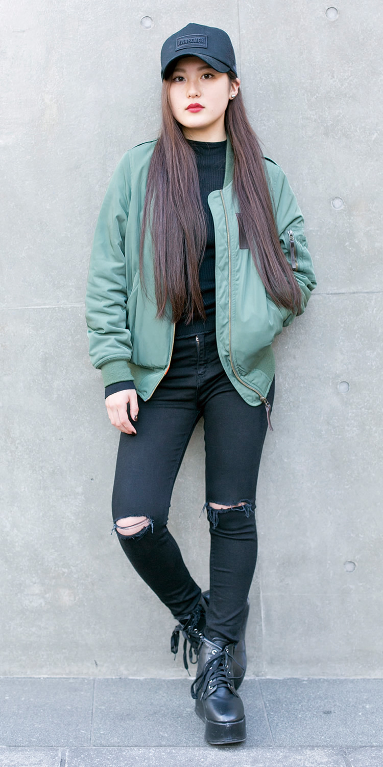 サイズ感のあるMA-1と古着っぽい巻きスカートが今日のポイントです。 ペコちゃんを見て研究しています!