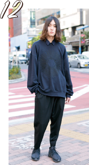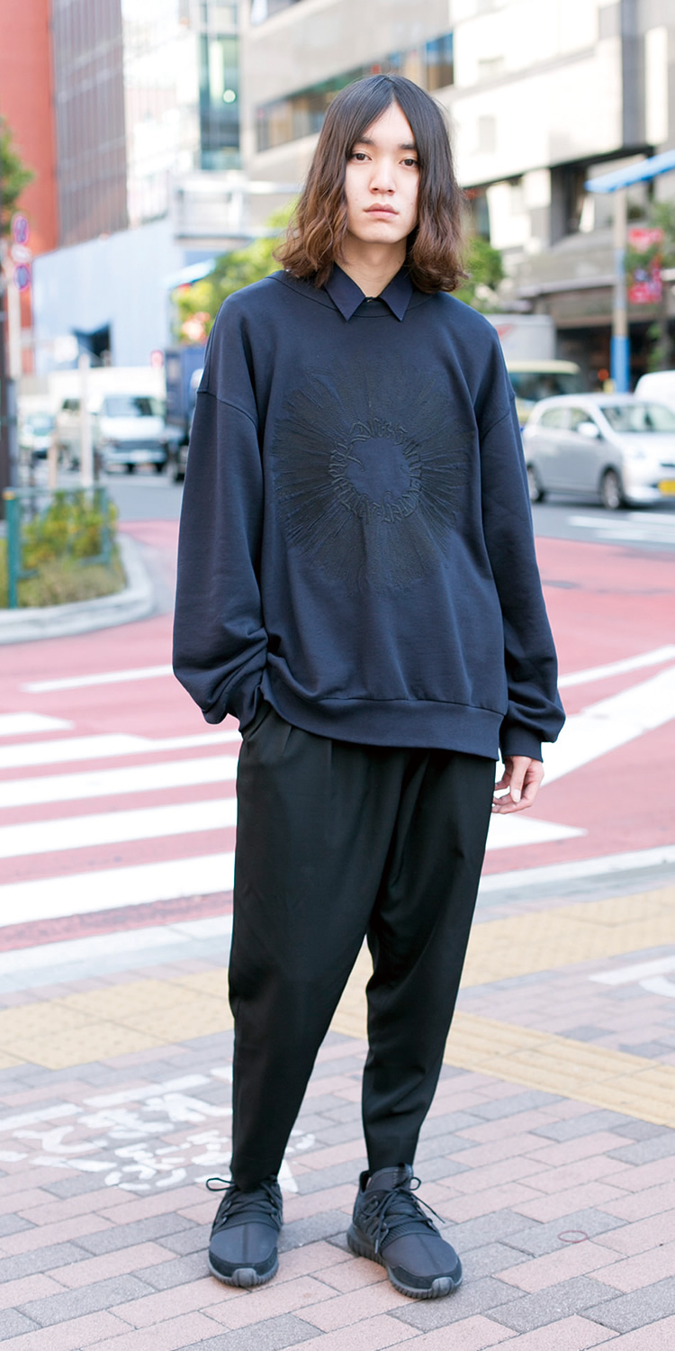 黒を基調にコーディネートしています。特にこだわっているのはスウェットで、胸の刺繍が気に入っています。