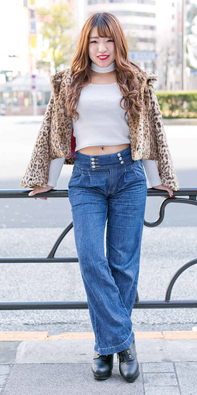 ショート丈が好きで、冬でも着ています。今日は全体的にシンプルなのでヒョウ柄でインパクトを強めています。