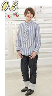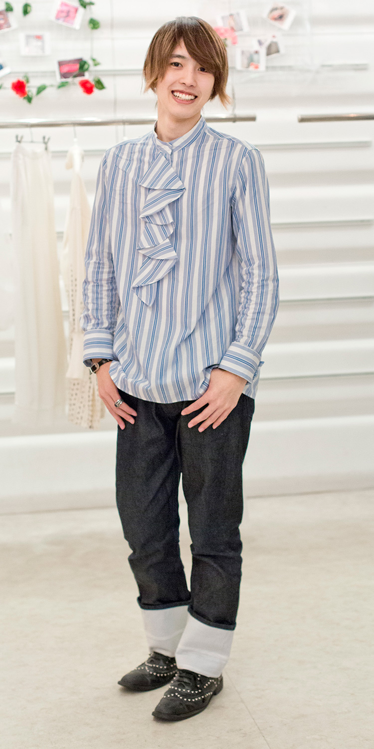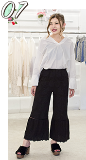 エレガントなフリルシャツにロックテイストな小物使いがポイント!!