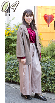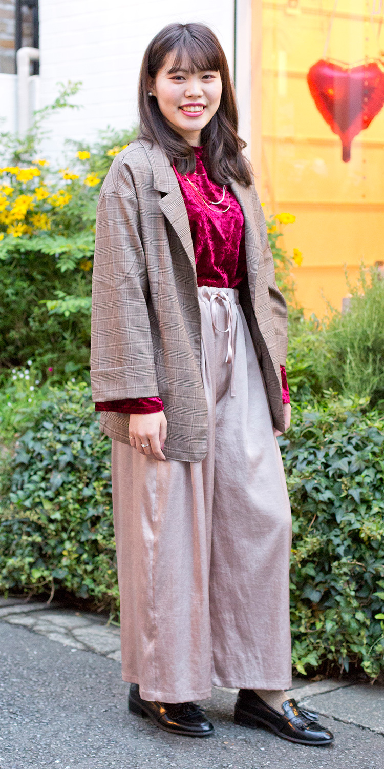 トレンドのチェックジャケットとベロアのトップスでスタイリッシュに秋らしくまとめました。