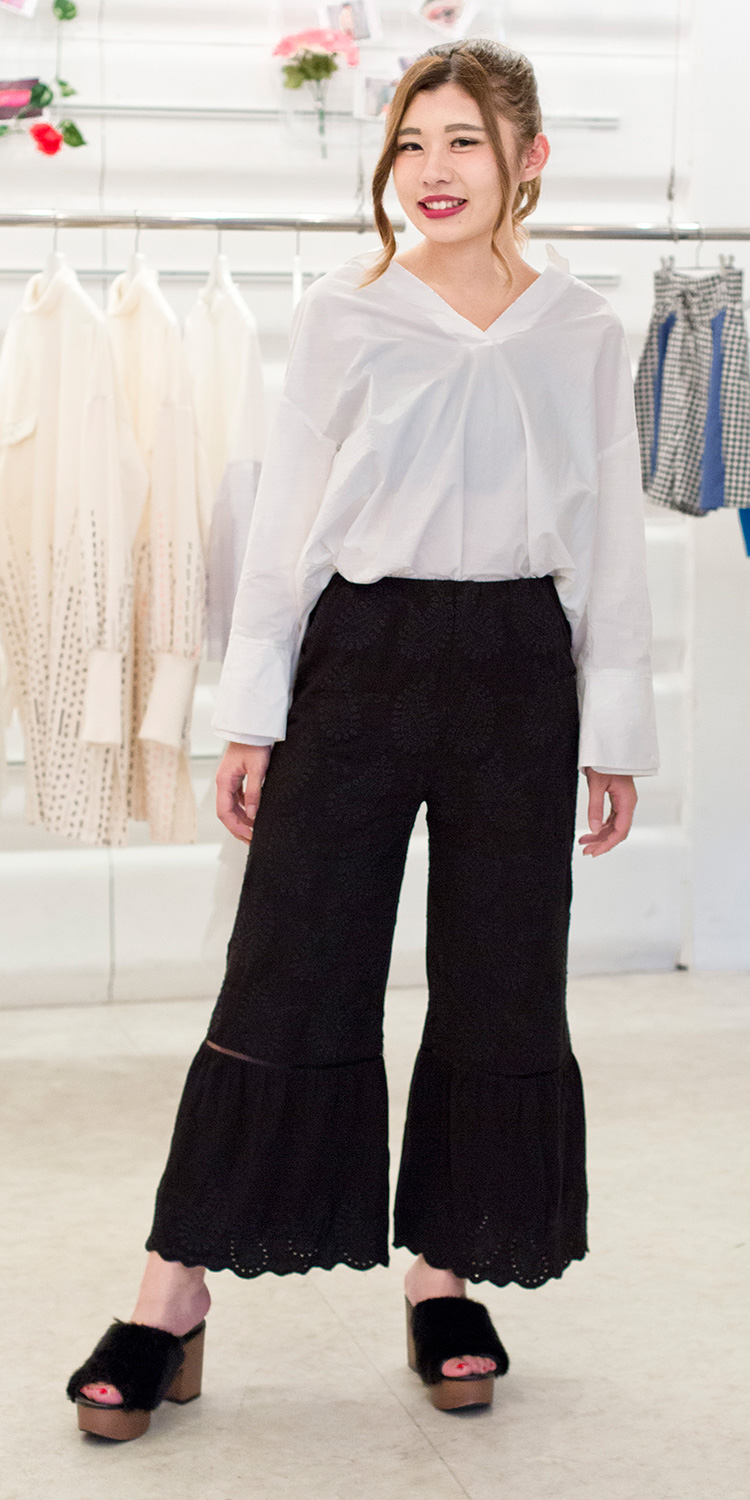 白と黒でかっこよく!パンツの裾が少し広がっているのがポイントです。