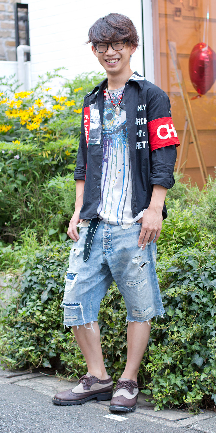 アナーキーシャツとリメイクのサルエルデニムがポイントです。