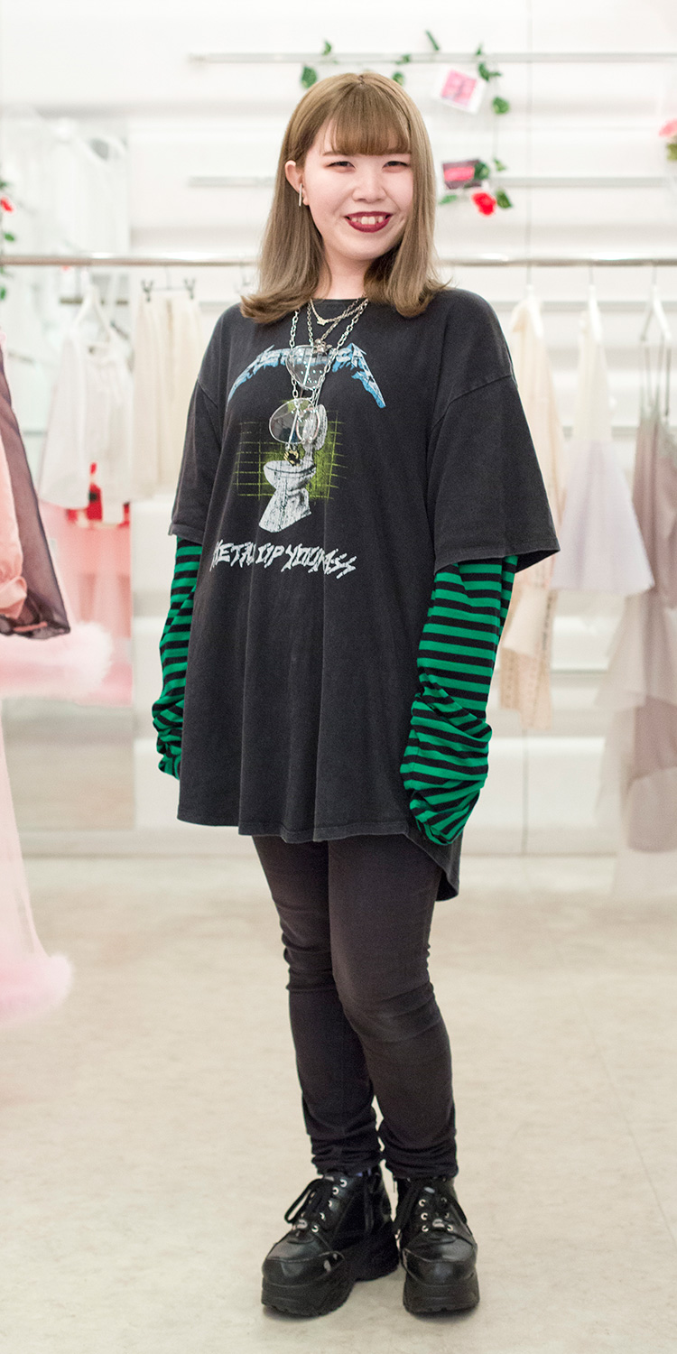 ビッグシルエットのTシャツにロングスリーブを合わせてトレンド感を。 好きなグリーンを差し色に入れました。