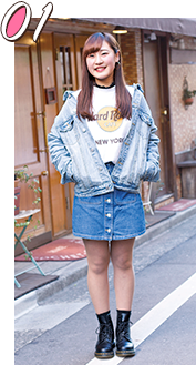 デニムのセットアップに、白い花柄のカーディガンを合わせて女の子っぽく。