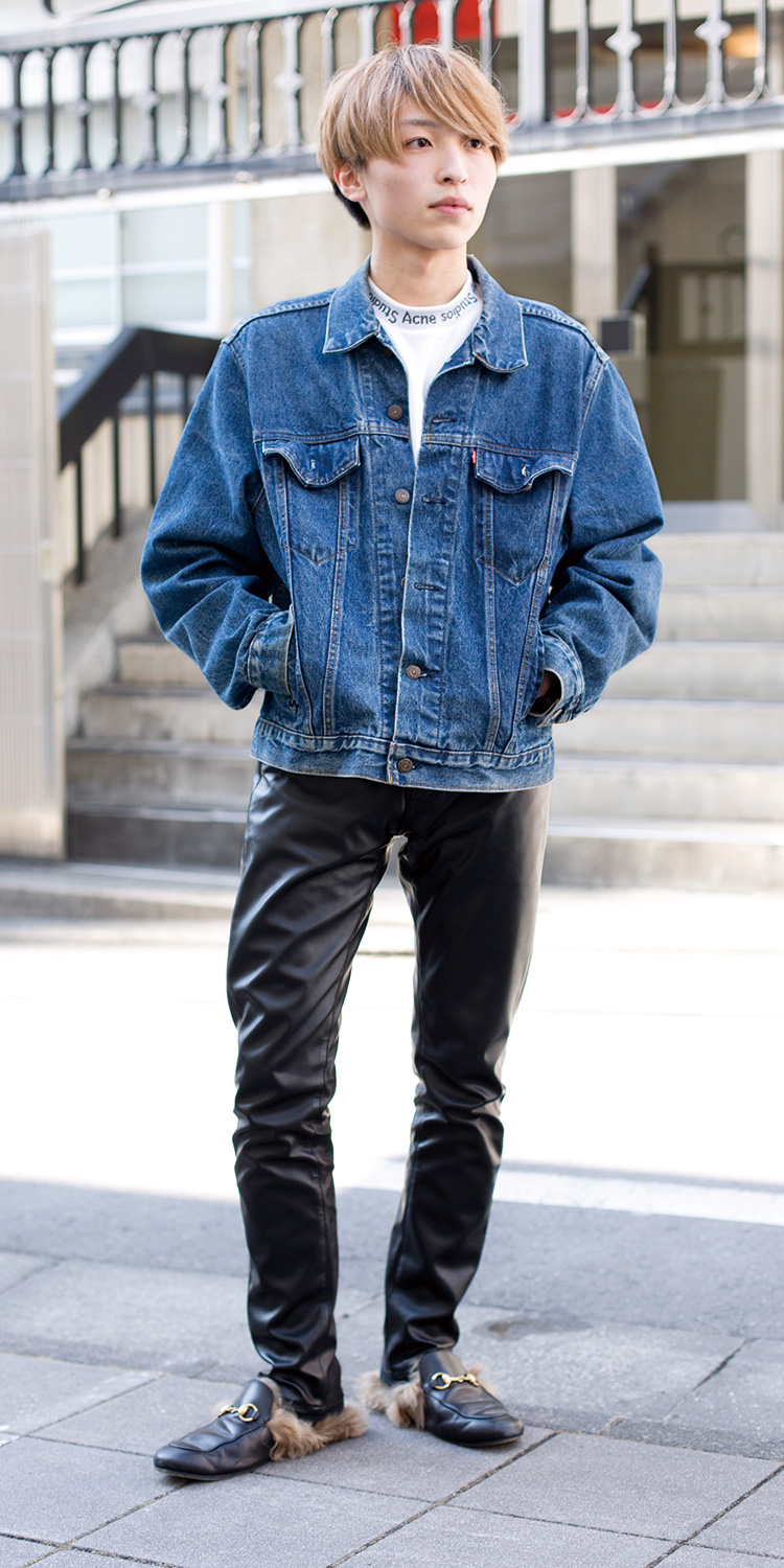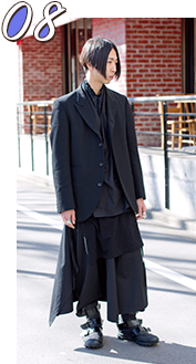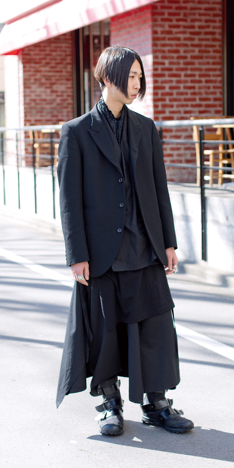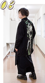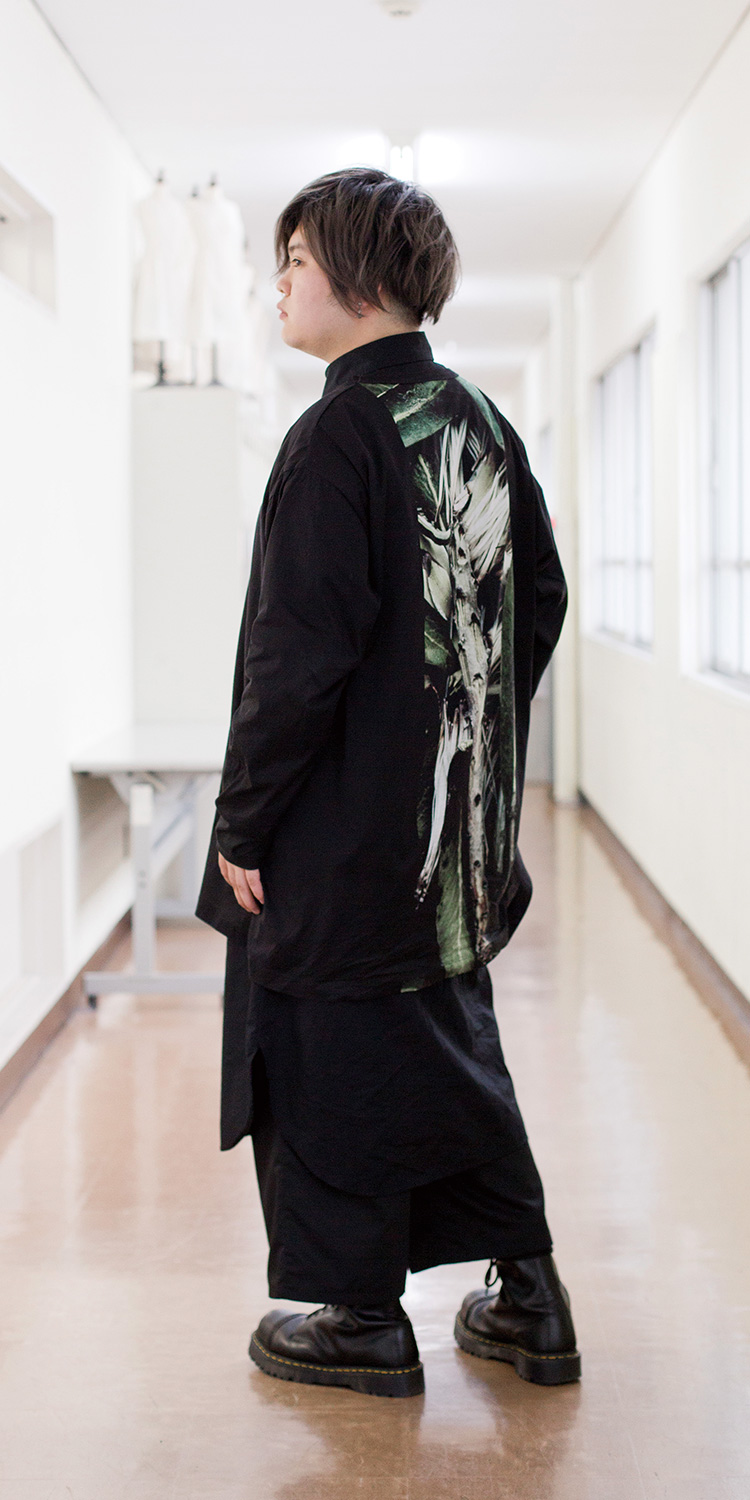 黒×黒で素材違いのレイヤードに。目を引くバックプリントが好き。