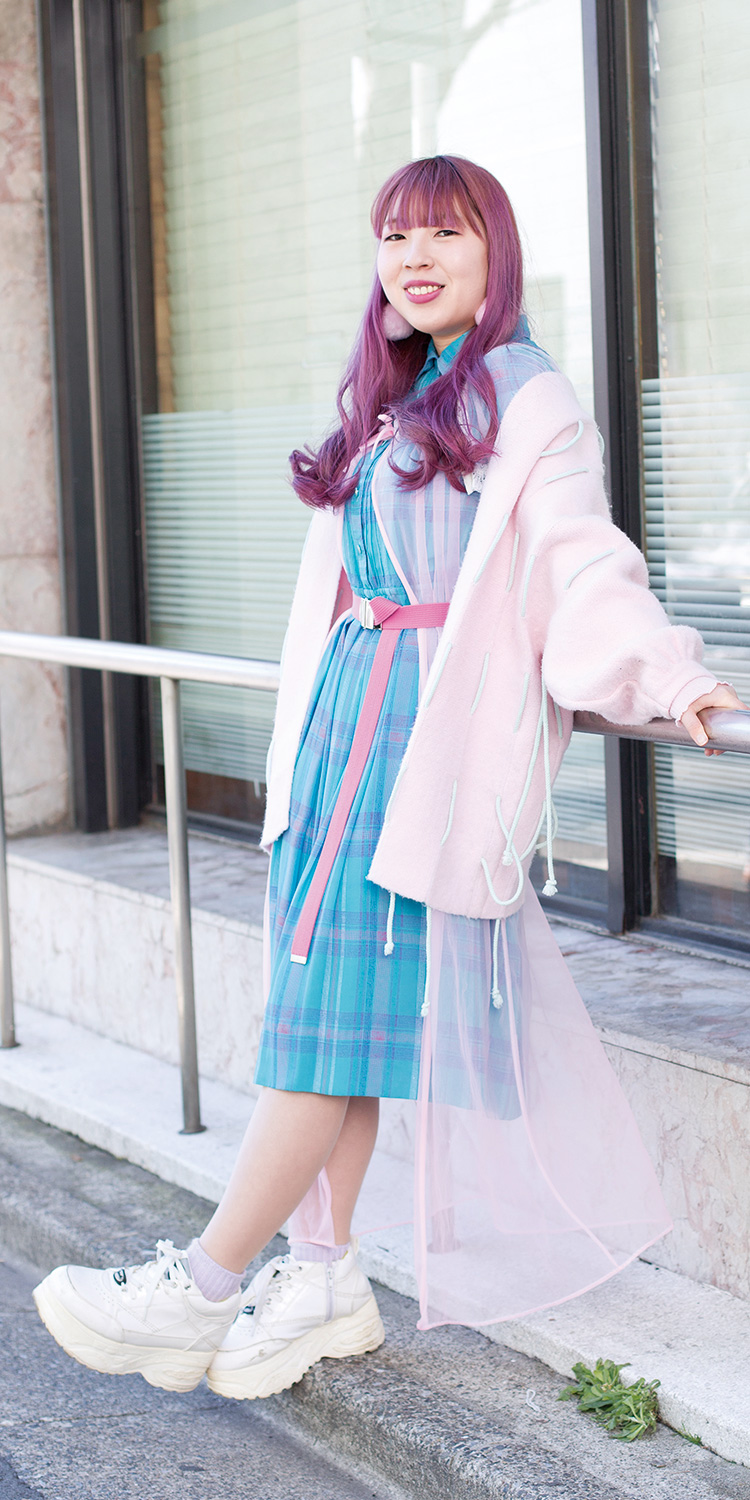 ピンクと水色で春らしいコーデに。アウターの綱紐に一目惚れしました。