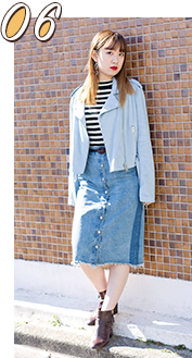 水色のスウェードジャケットをデニムと合わせて、爽やかなイメージに。
