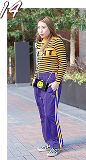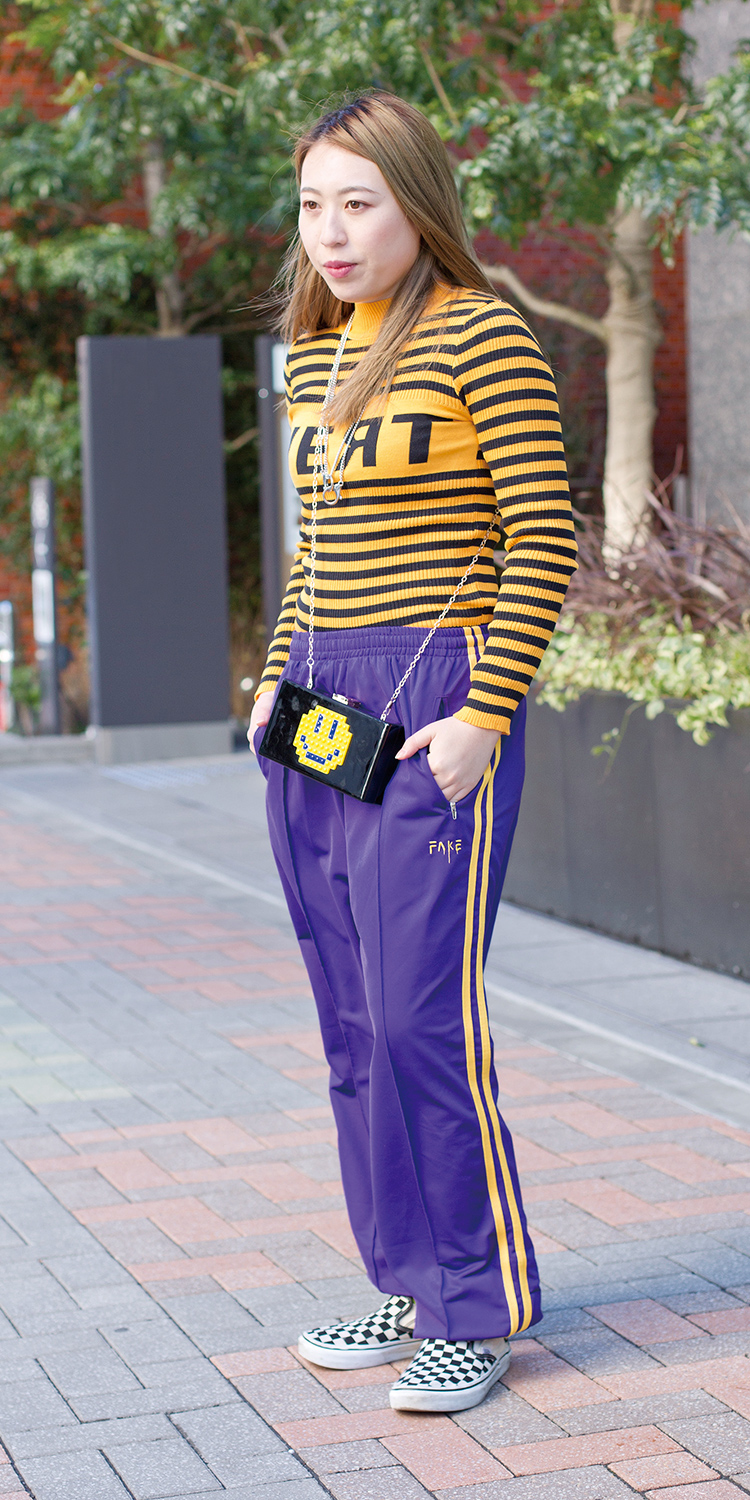 上下に黄色を取り入れ、スマイルマークのバッグをワンポイントに。