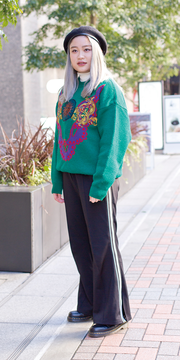 父からもらった緑のセーターを主役に全体をクール目にまとめました。