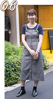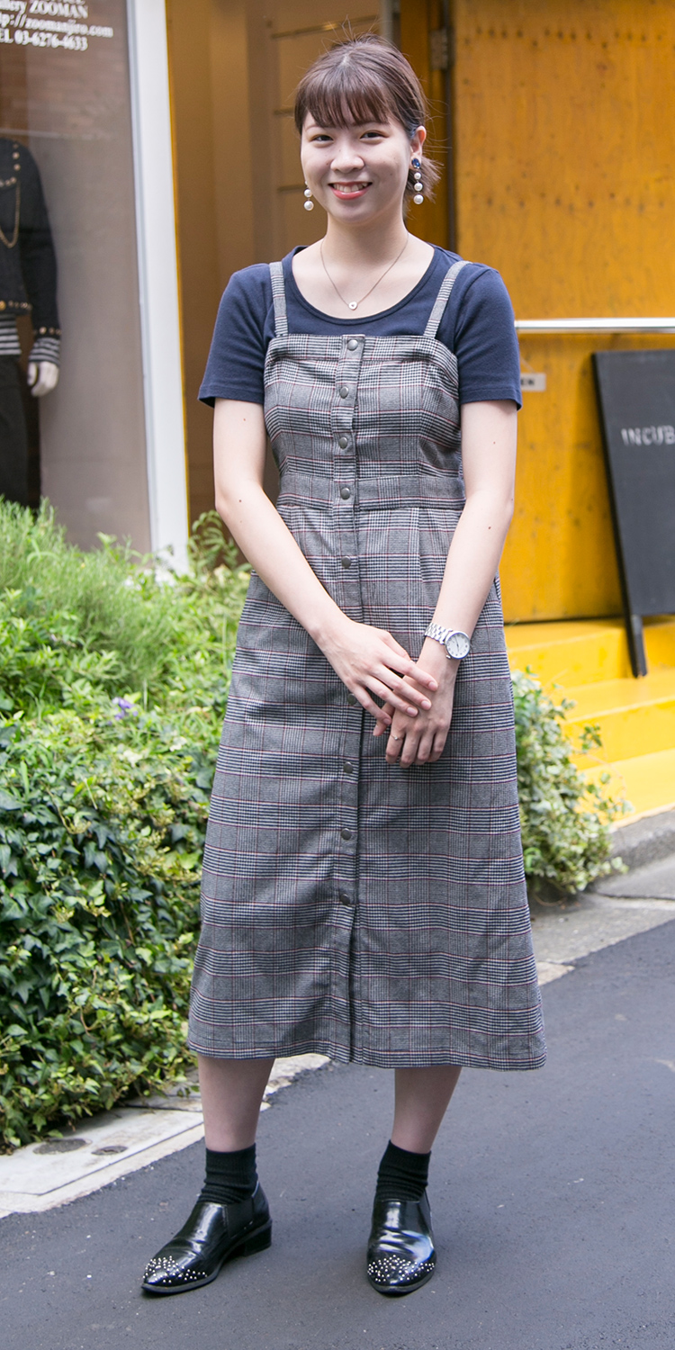 チェックのワンピースをメインに他のアイテムの色味を合わせました。