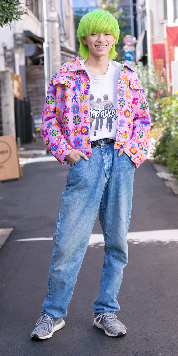 花柄ピンクのジャケット、原宿感、ユニセックスなスタイリング