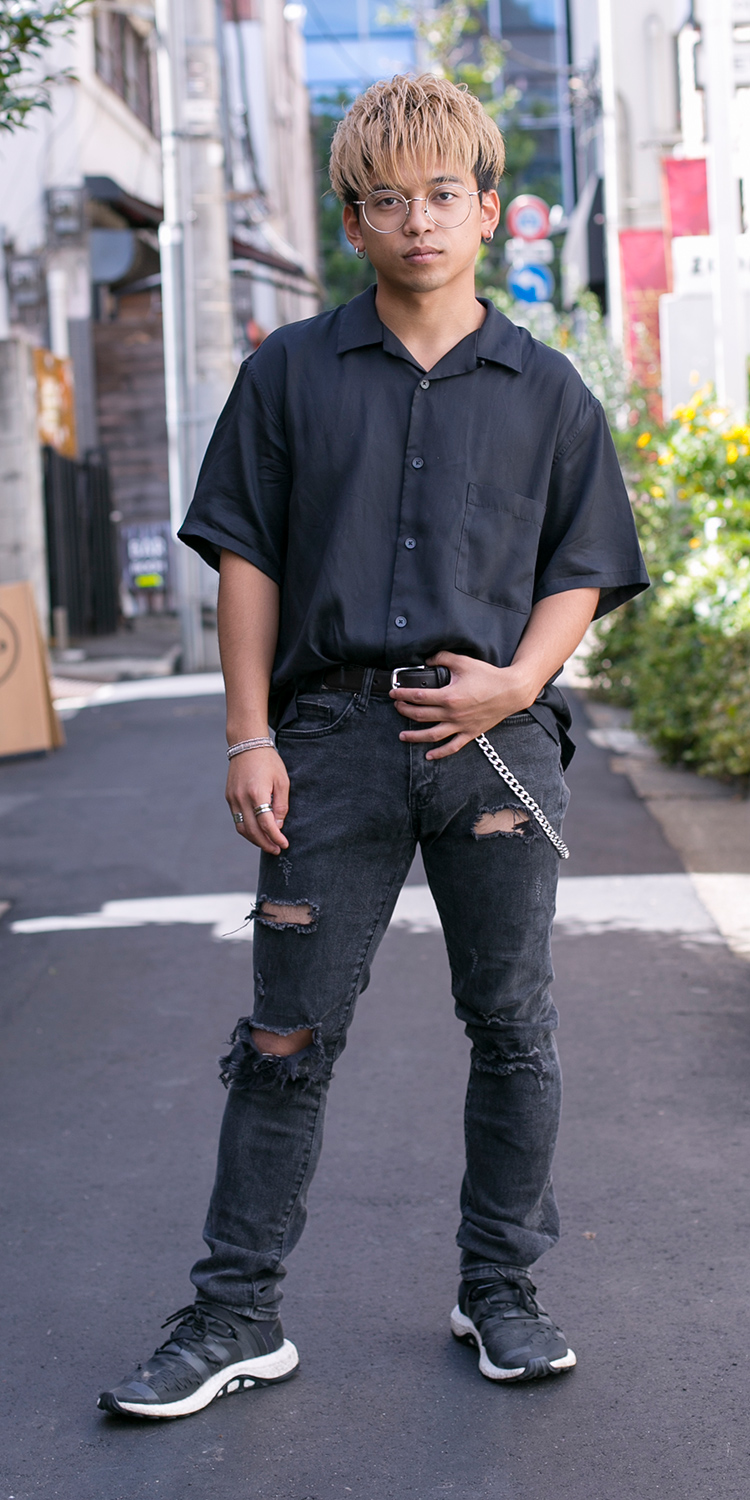 細身のダメージデニムにチェーンを付けたのがポイント。モノトーンでクールにまとめました。