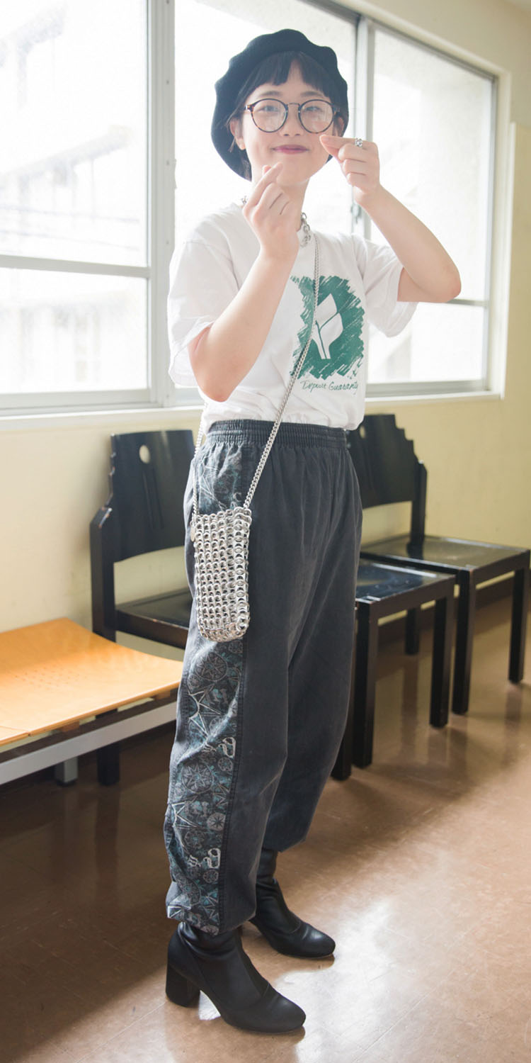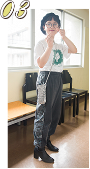 かわいいパンツイン。斜めがけのバッグをワンポイントに。