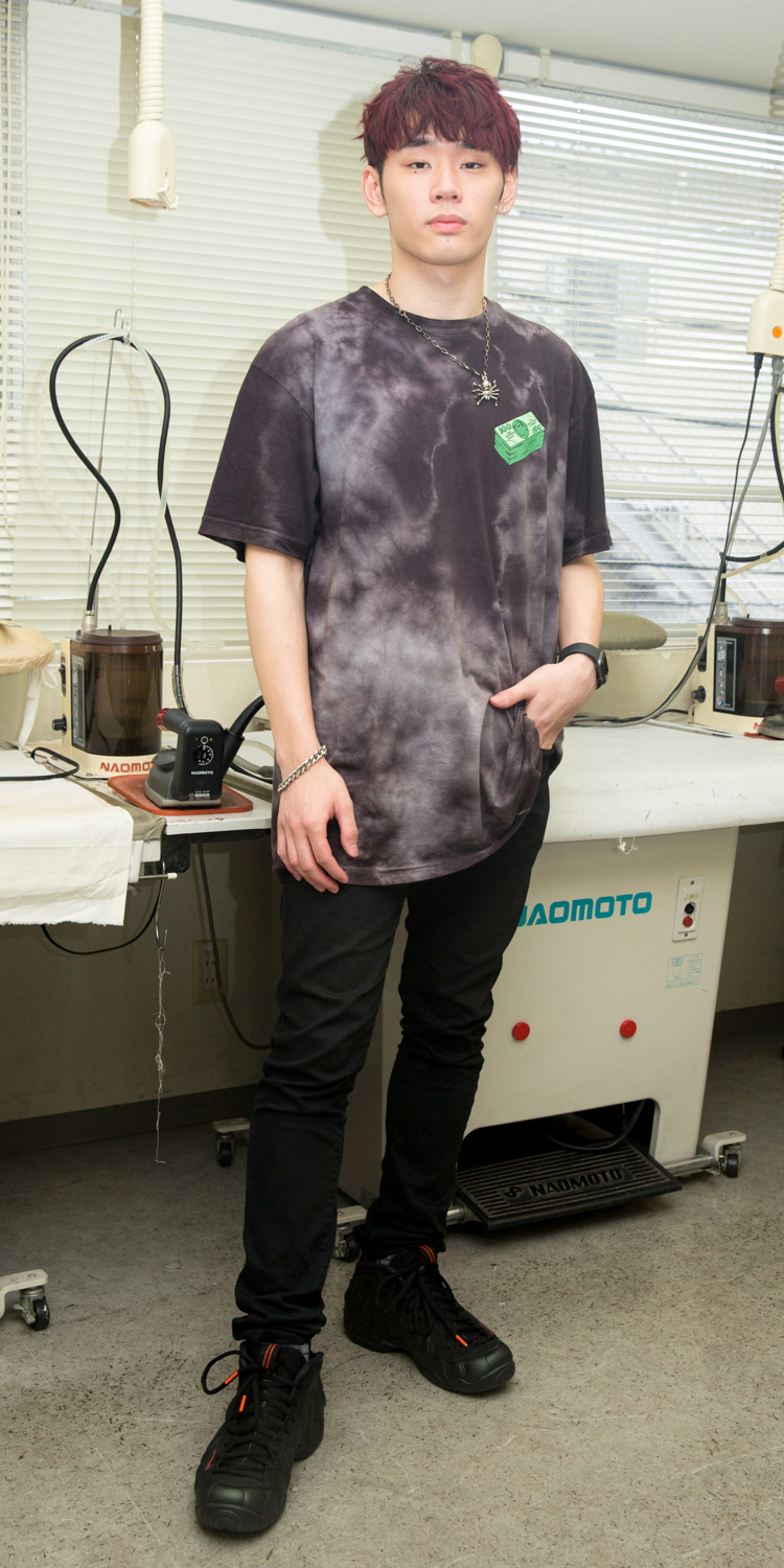全体的にシックベースで、Tシャツもシックなタイダイ柄です。シルバーアクセサリーをワンポイントに入れています。