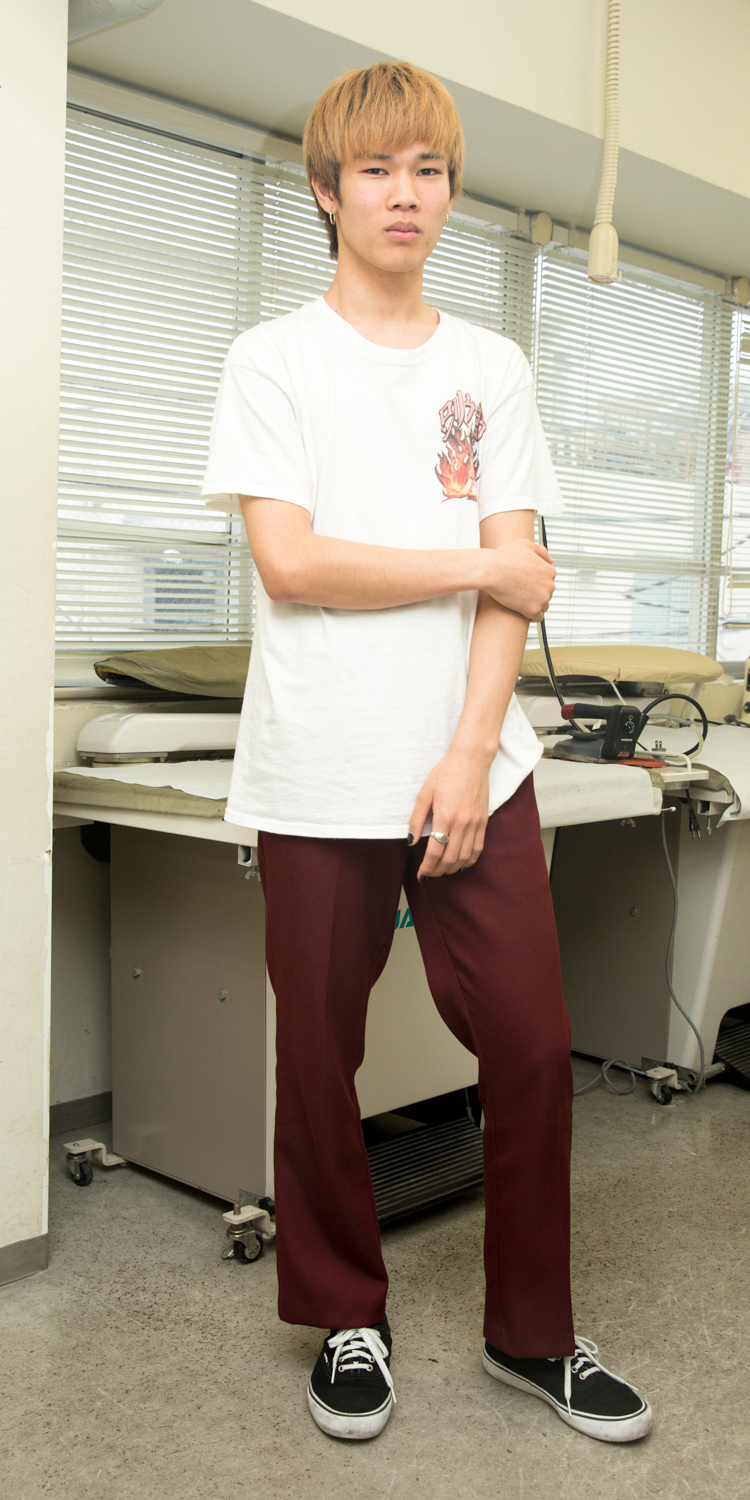 お気に入りのTシャツのイラストがレッドを基調としていたのでフレアパンツも同じレッド系で合わせました。