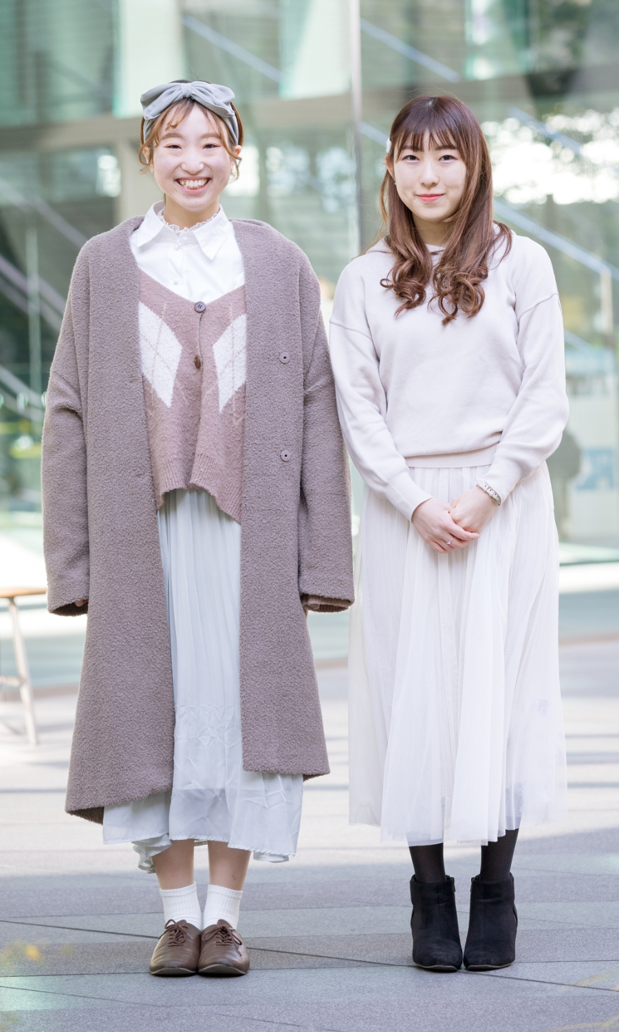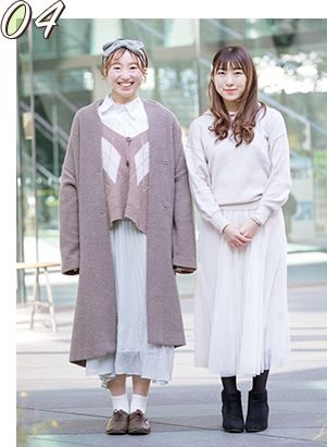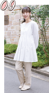 淡いカラーやゆるい素材で、大人っぽい装いに。
