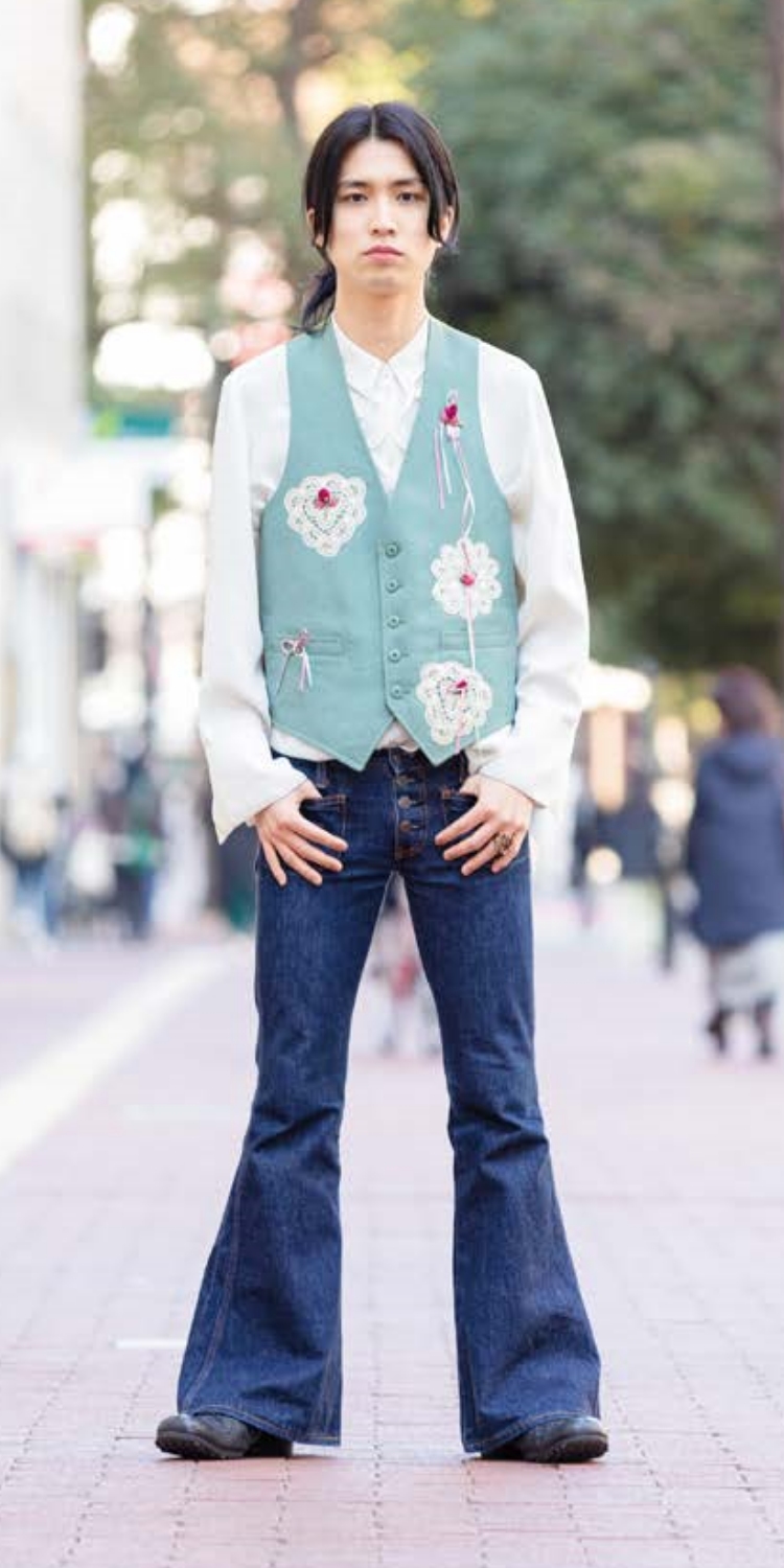 ベルボトムとべストで、ヒッピーなスタイルにしてみました。